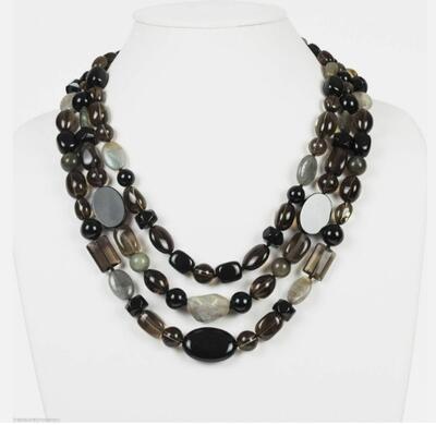 Amazing necklace consisting of square, round, and oval labradorite, black onyx, and smoky quartz bea...