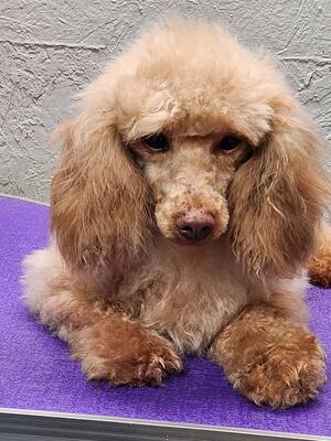 4-year-old poodle female up to date with shots get along with other dogs and children and weighs ab...