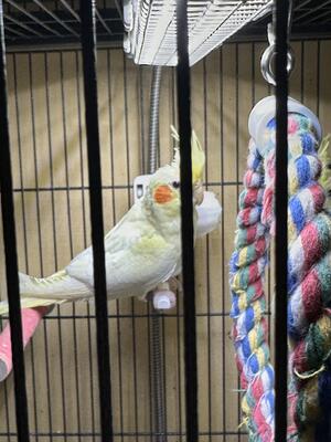 Mating pair of white face cockatiels with cage and all accessories including nesting box I am locat...
