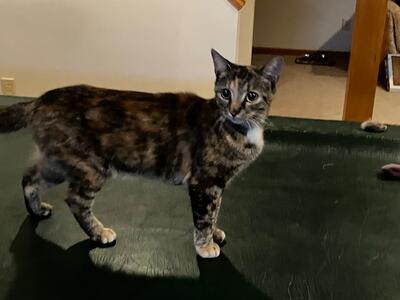 Young, one year, spayed female Torti short haired. Very sweet, soft meow when wants food, and well...