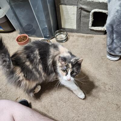 Anyone looking for a semi long haired female calico to love? VERY affectionate 🖤🤍🧡 Will ...
