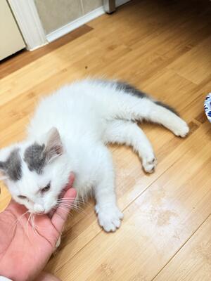 Sweet and healthy white kitten with cute gray spots on the head and tail. Very friendly, gentle, an...