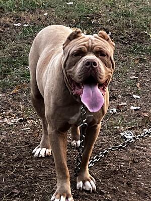 He is a very big boy. Absolutely stunning. Face is super wrinkly. Hes produced big and amazing pups....
