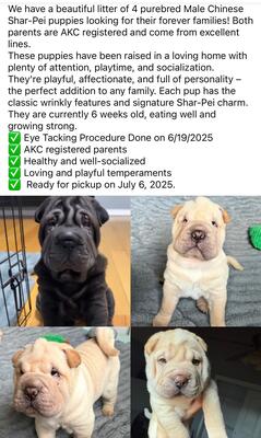 We have a beautiful litter of purebred Chinese Shar Pei puppies looking for loving homes! There are ...