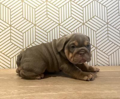 Blue tiny tri english bulldog female Akc