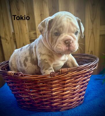 a beautiful pie merle english bulldog her name is stinkamuffin ..she has jennings blood.....