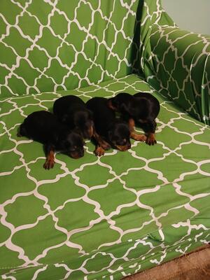 These Mini Pinscher / Mini Schnauzer puppies are currently 5 weeks old. Sadly, their mother passed, ...