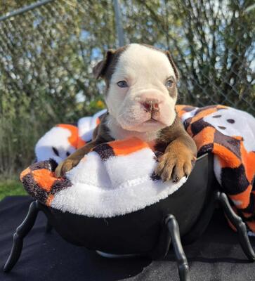 Meet our beautiful Zora. She is a 13 week old, Olde English Bulldogge puppy. She is a Lilac and Whit...
