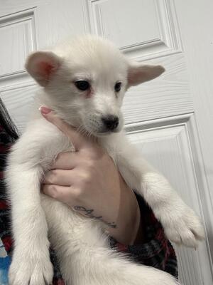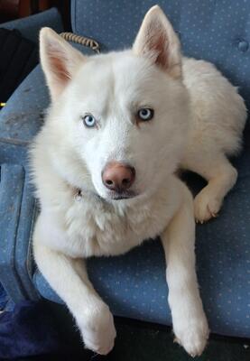 Male Husky hybrid. 2 years old. Blonde with blue eyes. Pink nose. Big fluffy tail. He is a sweet dog...