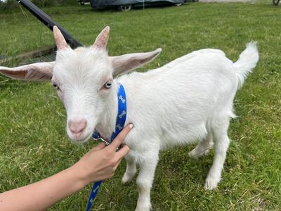 Born April 1st 2025, all white buck with blue eyes and horns, very friendly, was a multiple birth. H...