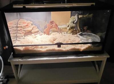 Female Sand boa roughly 3 years old. Comes with 55 gallon tank, decorations, heat lamp, and table it...