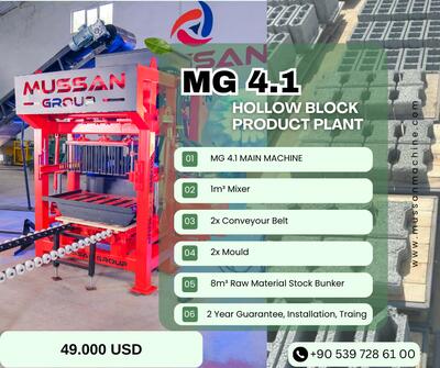 MUSSAN MG 4.1 HOLLOW BLOCK, PAVE, KERBSTONE MACHINE 1000 press cycle on 8 hours, every press means;...