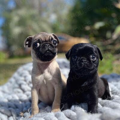 PUG PUPPIES: FAWN MALES AND FAWN FEMALES, BLACK MALES AND FEMALES