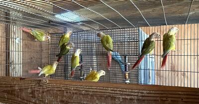 I have 9 Green Cheek Conures. Beautiful colors as you can see. Not sure of sex and they are not tame...