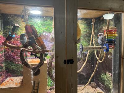 2 Indian Ringneck parrots. Was told they were around 3-4, comes with extra large lit up cage, whatev...