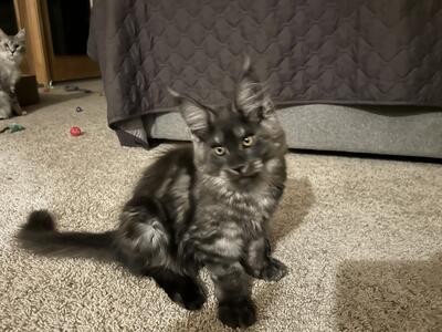 Beautiful One Yr old female Maine Coon Silver shaded . She's a cute talker , very loving , litter tr...