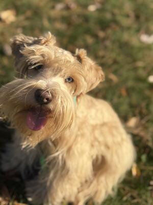 Bandit is a striking red wheaten Miniature Schnauzer with rare blue eyes and a warm, golden-rust coa...
