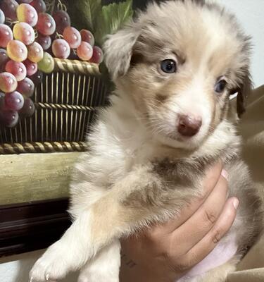 Australian Shepherd puppy, brown merle with blue eyes. I'm 8 weeks old, have my vaccination record, ...