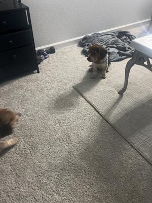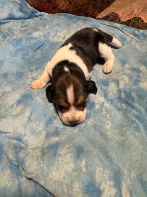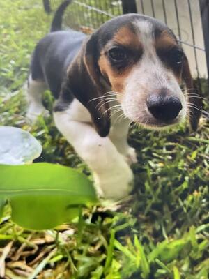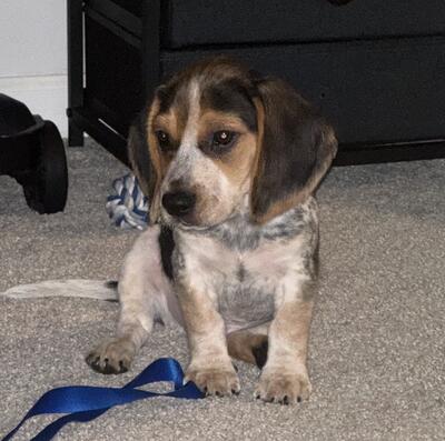 Beagle X Australian Shepherd male puppy ready for his forever home! He’s eating solid food and has...