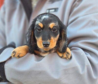 Long haired black and cream dapple dachshund. Born October 20th Ready to go December 16th Will ha...