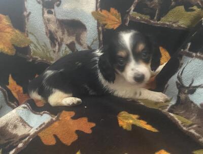 Beautiful tri coloring mini dachshunds, 2 Longhaired 1 male and 1 female and shorthaired piebald mal...