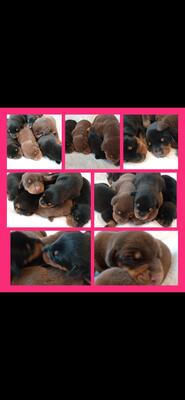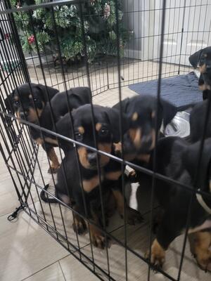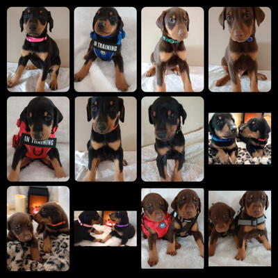 Doberman puppies. One black and rust male. Two black and rust females. One blue and rust female. Two...