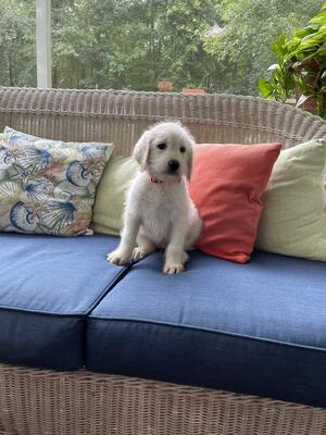 White female 50/50 Labradoodle. She has a great personality, super sweet, working on create training...