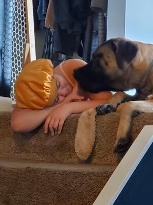 Male mastiff/ boxer cross. 130 lbs and 4 years old. I am rehoming due to my health issues. He is a g...
