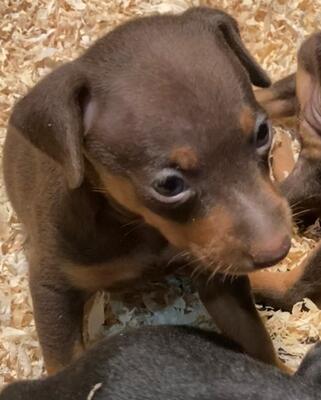 Camero had 4 puppies born on June 7, 2025. I have 1 Male and female left, chocolate and tan. Tail d...