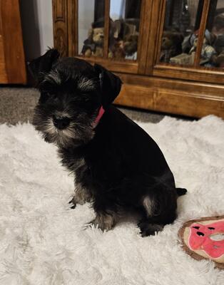 AKC registered Black and Silver Female Miniature Schnauzer Puppy. Cutie Pie has wonderful markings a...
