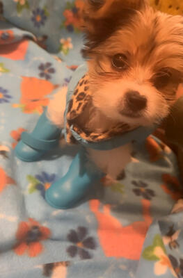 This little guy is yorkie/poodle/Australian Shepherd all teacup and toys so will stay under ten poun...