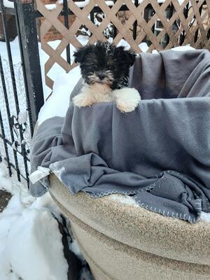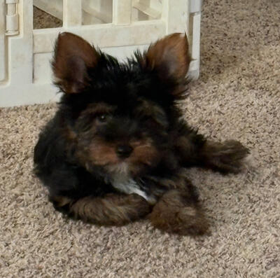6 week old yorkie pooh male puppy..both parents are yorkie poohs.. mother is 5 pounds dad is 15 poun...