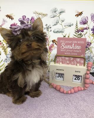 Chocolate male. DOB January 16 2025. We are in Ohio. Cabinhill Yorkshire Terriers. 4 lb tiny guy. $...