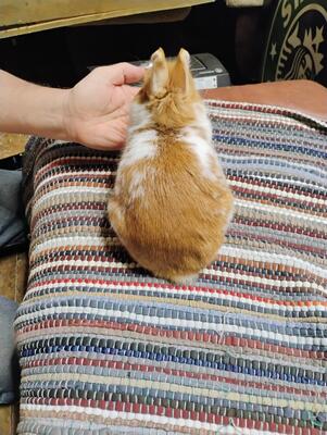 6 1/2 month broken orange Netherland Dwarf buck. 1.12lbs. Sire has three grand champion legs. Not pe...