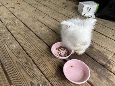 12 week old white doe She loves to cuddle Comes with cage, litter box. Food. hay bowls and brush ...