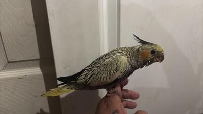 Born Feb 5, 2025. yellow head and body front and tail feather, back light green that looks to be t...