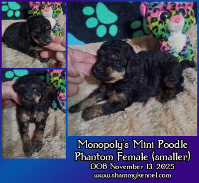 Black phantom female miniature poodles. Brown carriers. DOB Nov. 13, 2025. Will have age appropri...