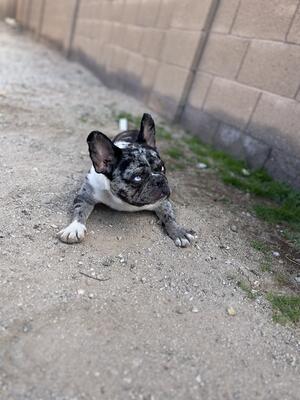 beautiful female merle frenchie looking for her forever home comes with big rose gold crate, harness...