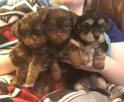 2 brown chocolate female Shorkies with greenish eyes and 1 female black and tan Shorkie. Mom is a Y...