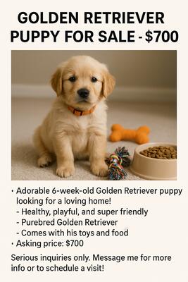 Golden Retriever Puppy for Sale ā $700 Adorable 6-week-old Golden Retriever puppy looking for a...