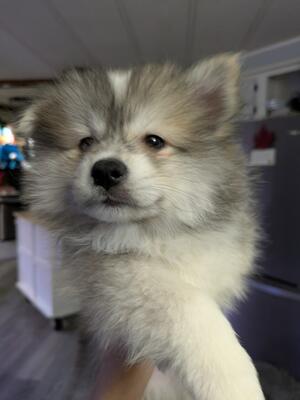 A snow-white Pomeranian puppy- boy is growing up, currently 50 days old. If you like this puppy, you...