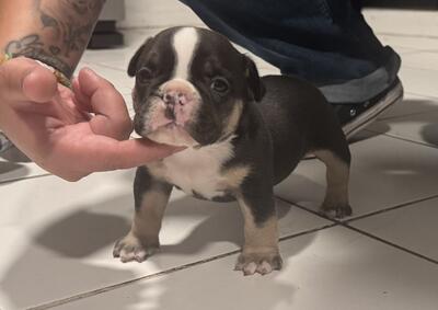 8-week-old female American Bully puppy with black and white tri-color markings. She has been deworme...