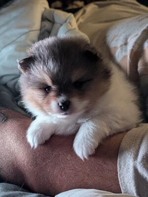 Three female AKC Pomeranian puppies. Two merle parti with tan markings, one trip color parti. Very s...