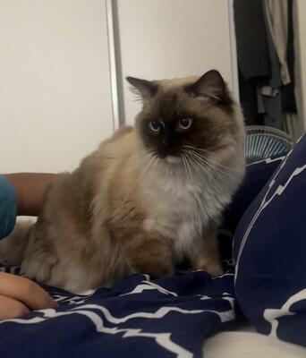 Meet this one-year-old boy kitten with mesmerizing blue eyes. He''s calm, kind, and friendly-looking...