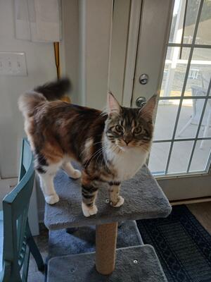 Beautiful, friendly female Maine Coon kitten for rehoming. Not spayed. Has had two initial sets of s...