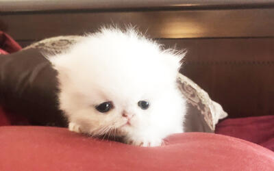 Pure white Persian girl kitten with blue eyes. Her nose and paw pads are pink. Her personality is ca...