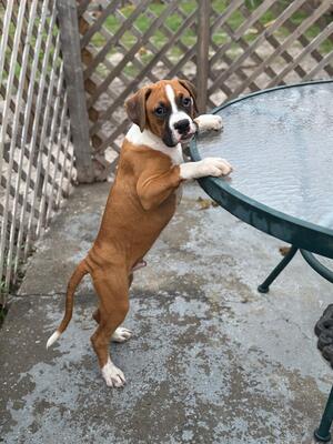 Meet Carter, an adorable AKC-registered classic fawn male Boxer. This playful pup is bursting with e...