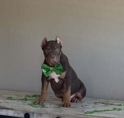 Chocolate tri male Xl American Bully 13 weeks Abkc reg Utd on shots Health Certificate ...