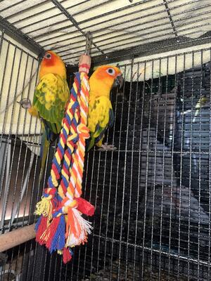 2 BEAUTIFUL Young sun conures for rehoming Rehoming fee per bird will discount if rehomed togethe...