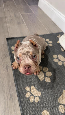 4 month old Micro Merle American Bully puppy for sale. He will be 35lbs full grown. Crown Bloodline!...